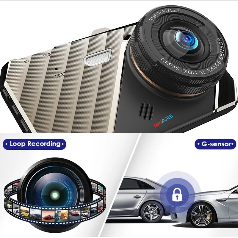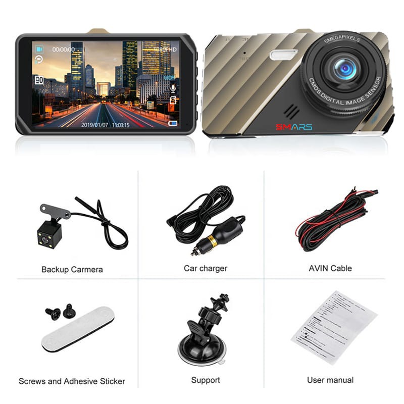 SMARS Car Dash Cam 4″ Touch Screen | 1080P HD Dual Lens DVR | 170° Wide Angle | Loop Recording | G-Sensor | Front & Rear Camera
